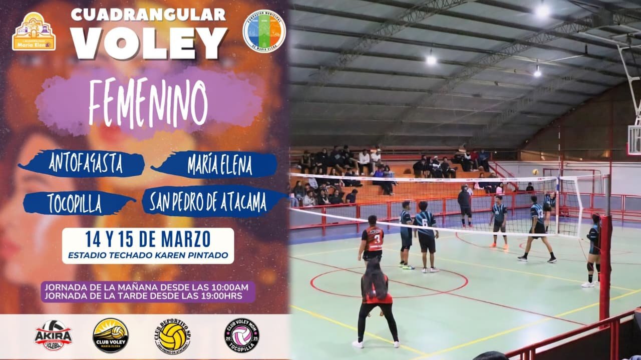 En el marco del Mes de la Mujer, la Ilustre Municipalidad de María Elena y la Fundación de Cultura, Turismo y Deporte invitan a la comunidad a vivir el Cuadrangular de Vóley Femenino, que reunirá a destacadas jugadoras de distintas comunas de la región.