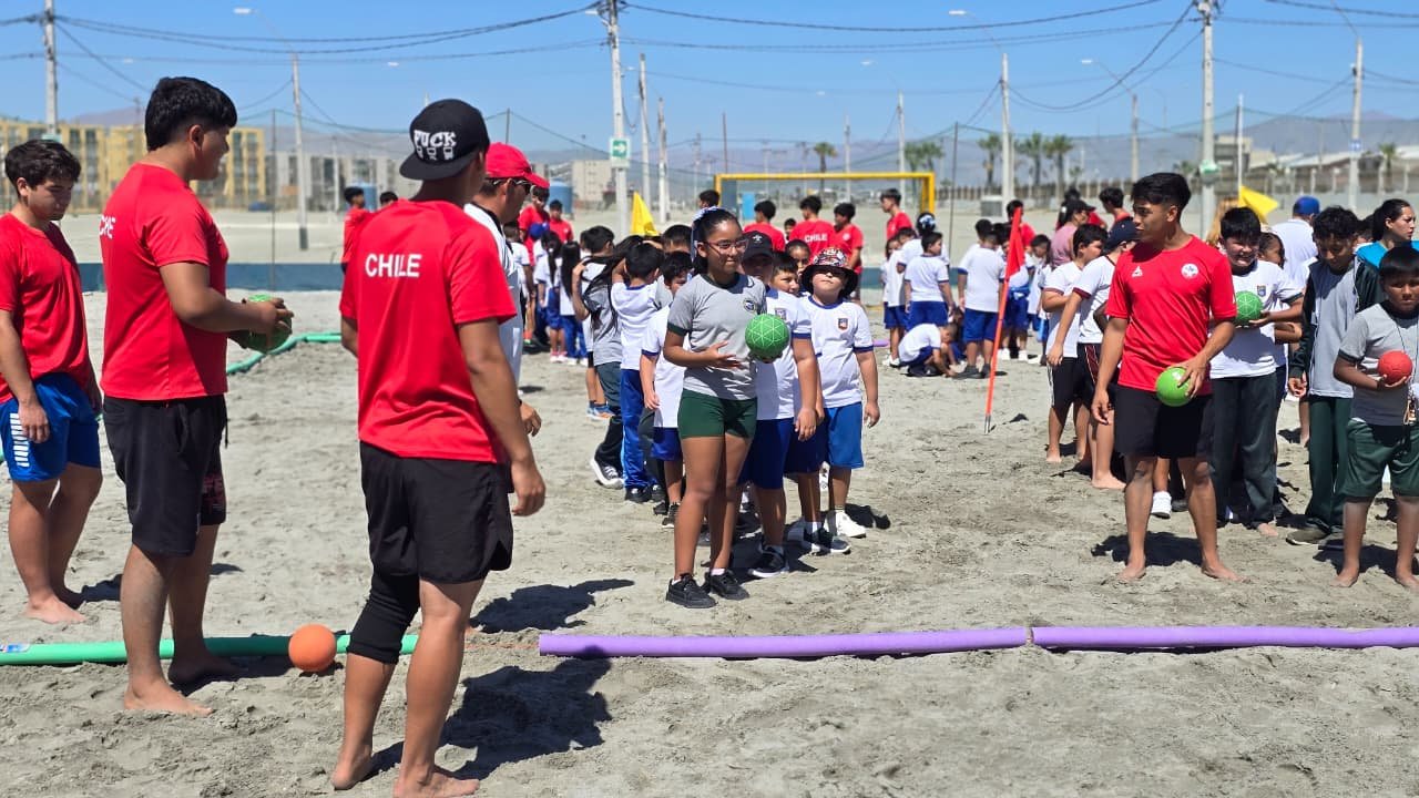 Más de 120 niños y niñas de Mejillones vivieron una jornada inolvidable junto a la selección chilena juvenil de balonmano playa, en una clínica deportiva que acercó el alto rendimiento a los estudiantes de tercero a quinto básico y sembró nuevas ilusiones deportivas en la comuna.